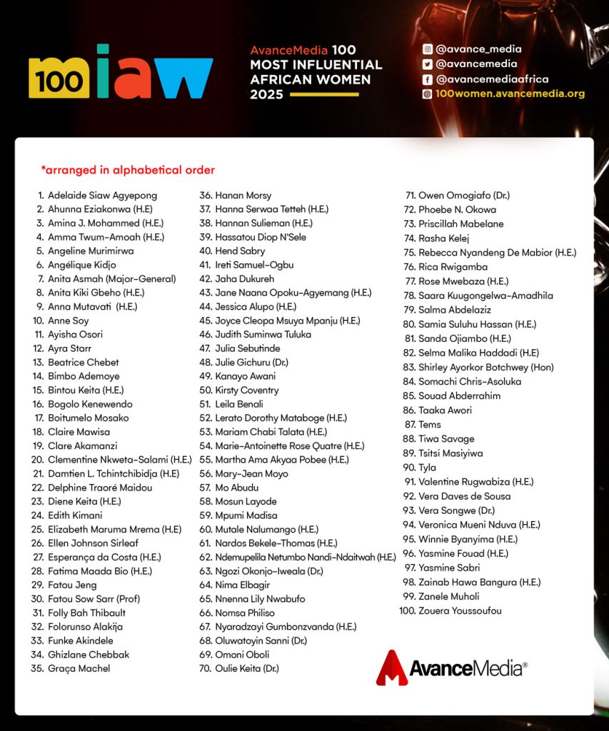 Below is Avance Media’s 2025 100 Most Influential African Women, arranged in alphabetical order: